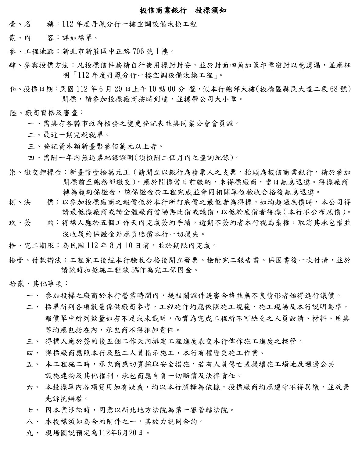 2023-06-15 板信商業銀行112年度丹鳳分行1樓空調設備汰換工程招標案 1. 領標地點:板信商業銀行總務部財產管理科(板橋區縣民大道2段68號30樓) 2. 承辦人員:黃子惟先生 (02-29629170*2414) 3. 招標文件領取方式:現場領標(不提供電子領標) 4. 領標時間:112年6月14日上午9點至6月17日下午5點整 回上一頁