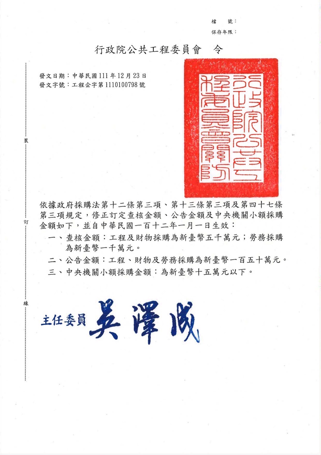 轉發公共工程委員會函-修正採購法條例案,詳如附件。